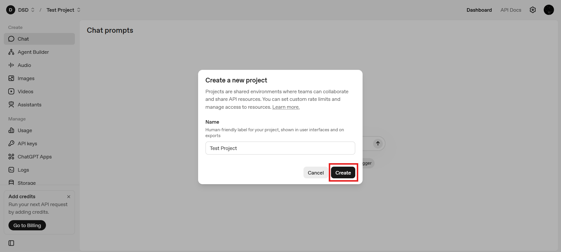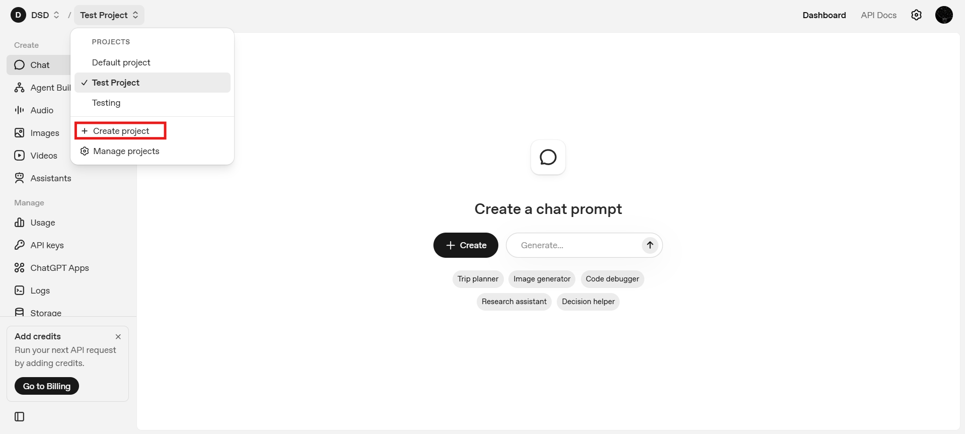 OpenAI organizes API usage around projects, where each project functions as a logical container for API keys, usage and billing, and permissions or access control. You may create a new Project by clicking on the Create Project button in the top left dropdown. Otherwise, you can continue with the default project.
