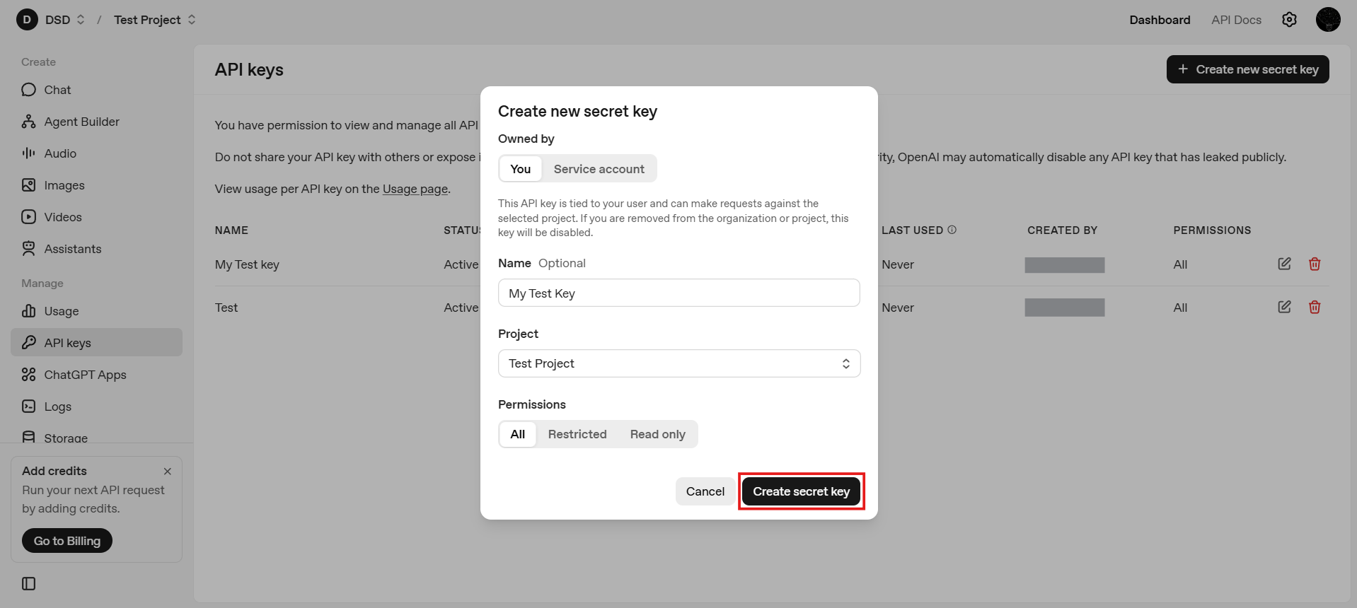 OpenAI allows you to define permissions for each API key. Permissions control what the key is allowed to do, such as which APIs they key can access and whether it has full or restricted capabilities. As a general principle, apply least privilege: grant only the permissions necessary for the intended use case.