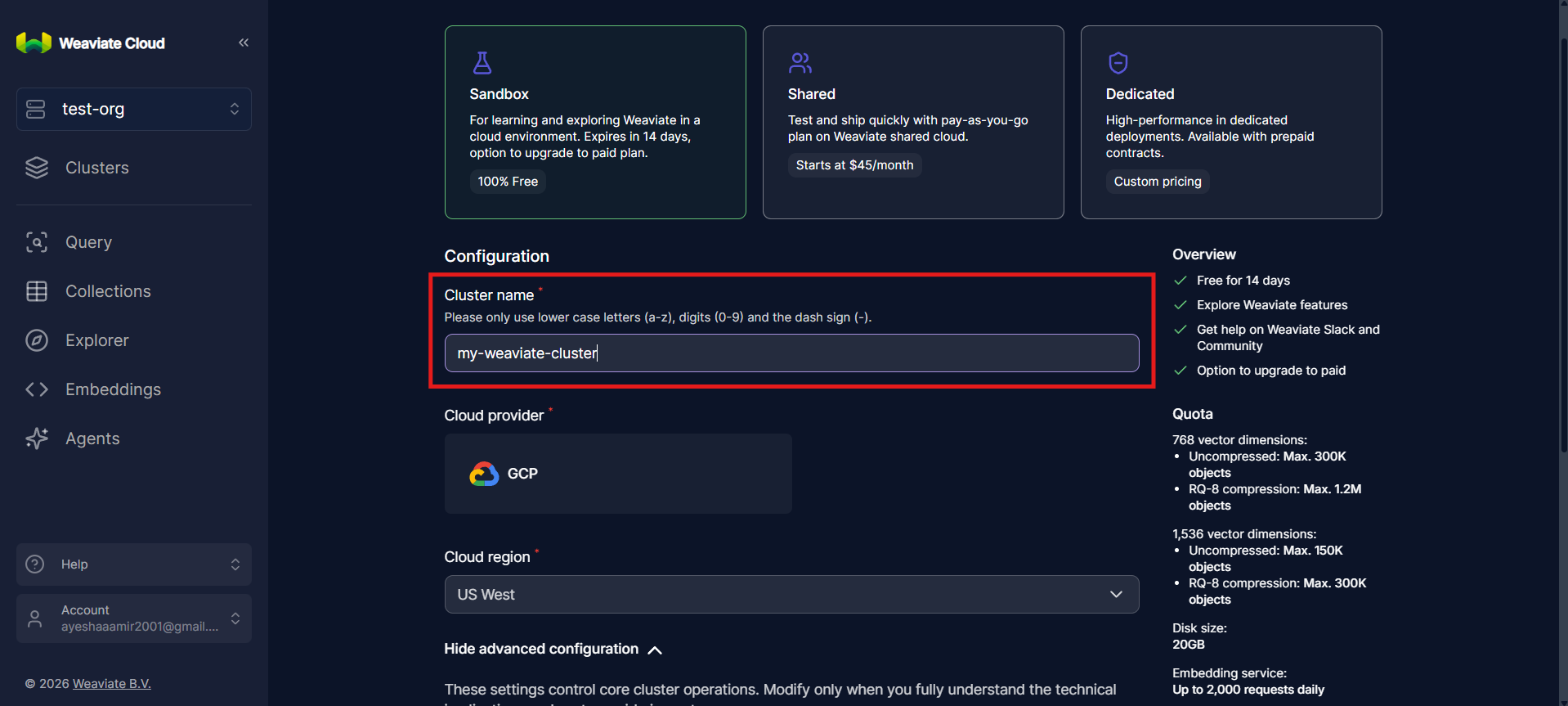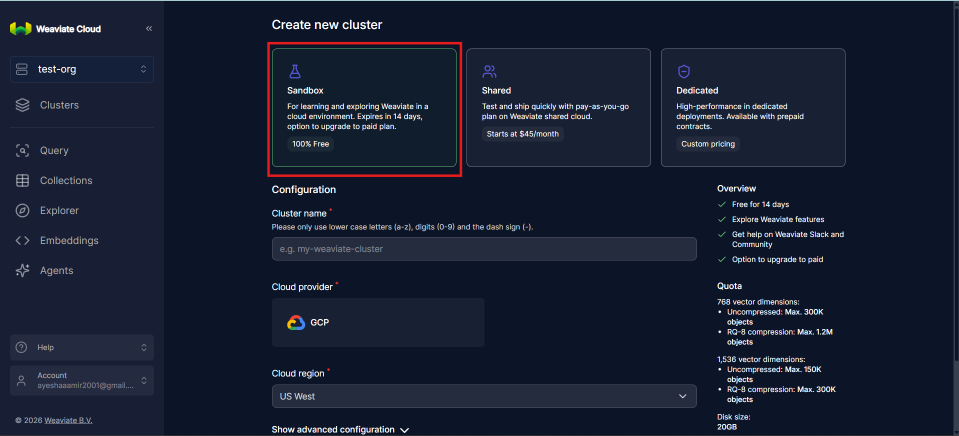 For this tutorial, select Sandbox. It provides everything needed to explore how a weaviate cluster works without introducing unnecessary infrastructure complexity.
