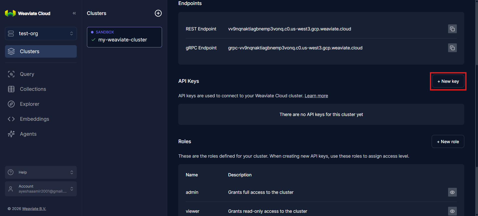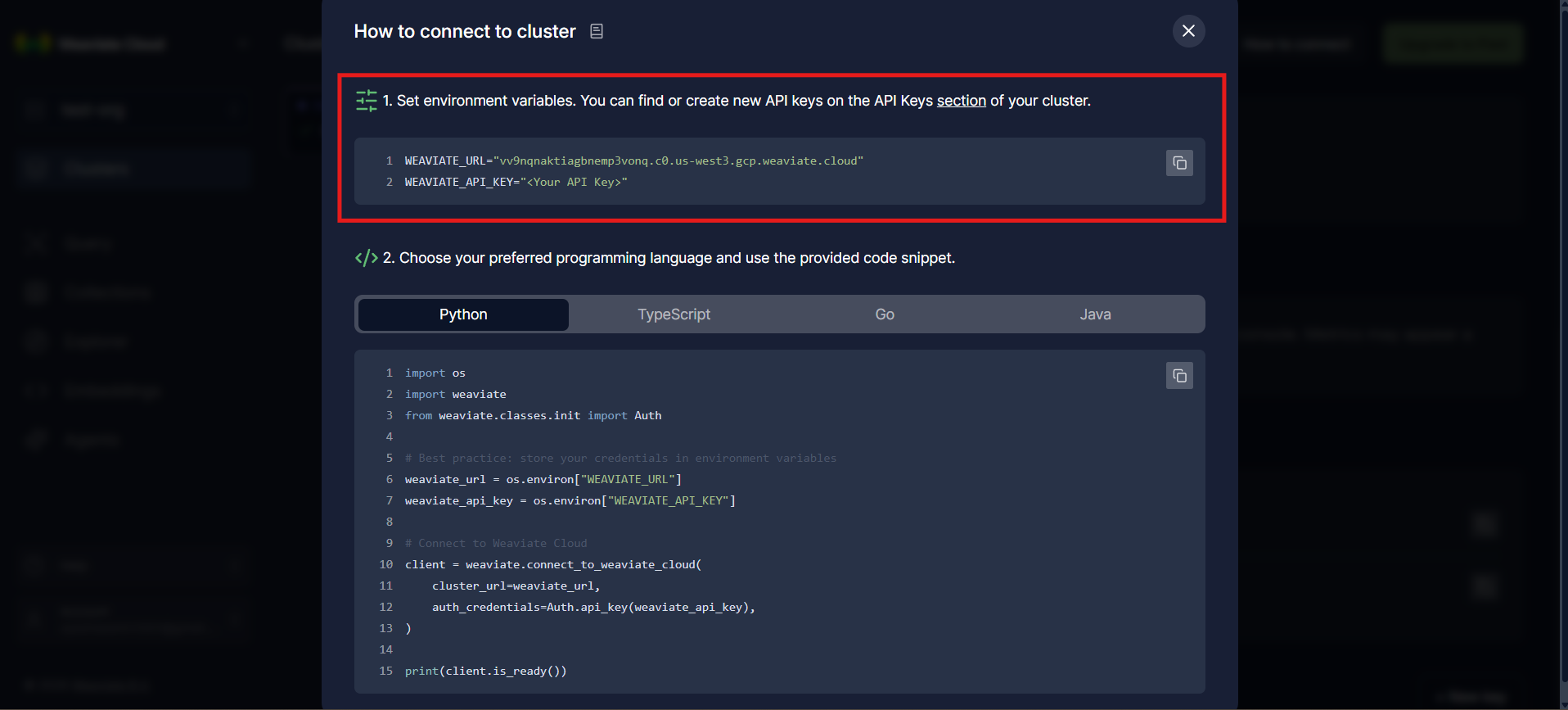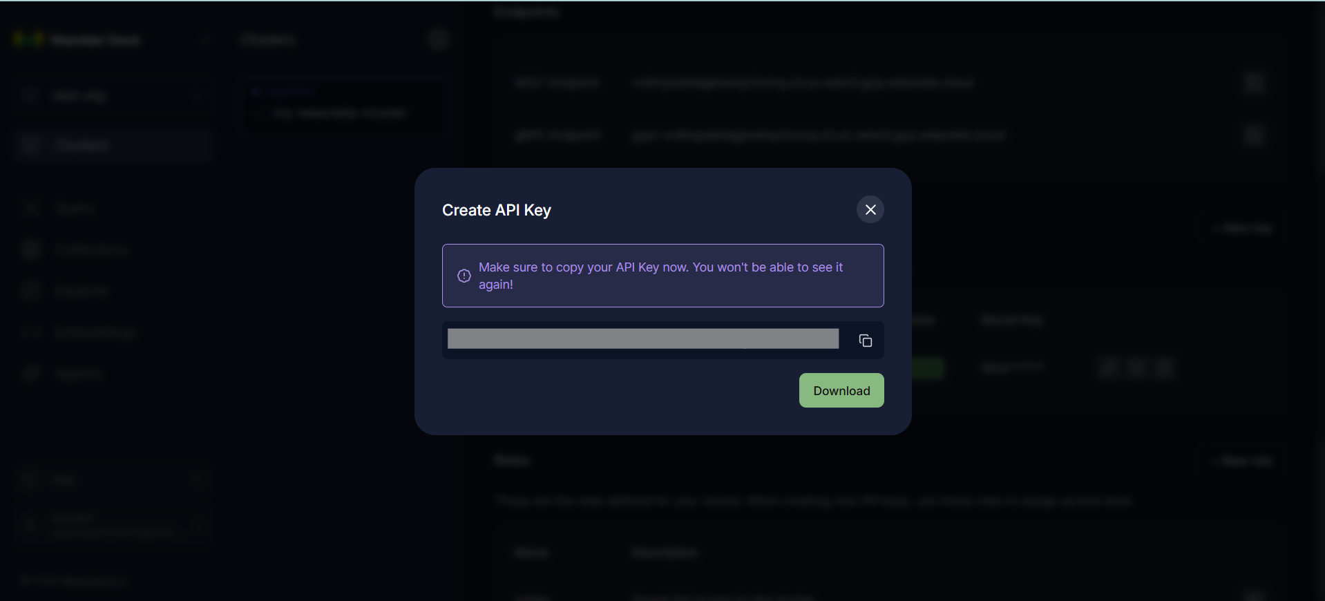 At this point, your Weaviate cluster is fully provisioned and accessible. You now have a running vector database, an authenticated API endpoint, and the necessary credentials ready to integrate directly into your application code.