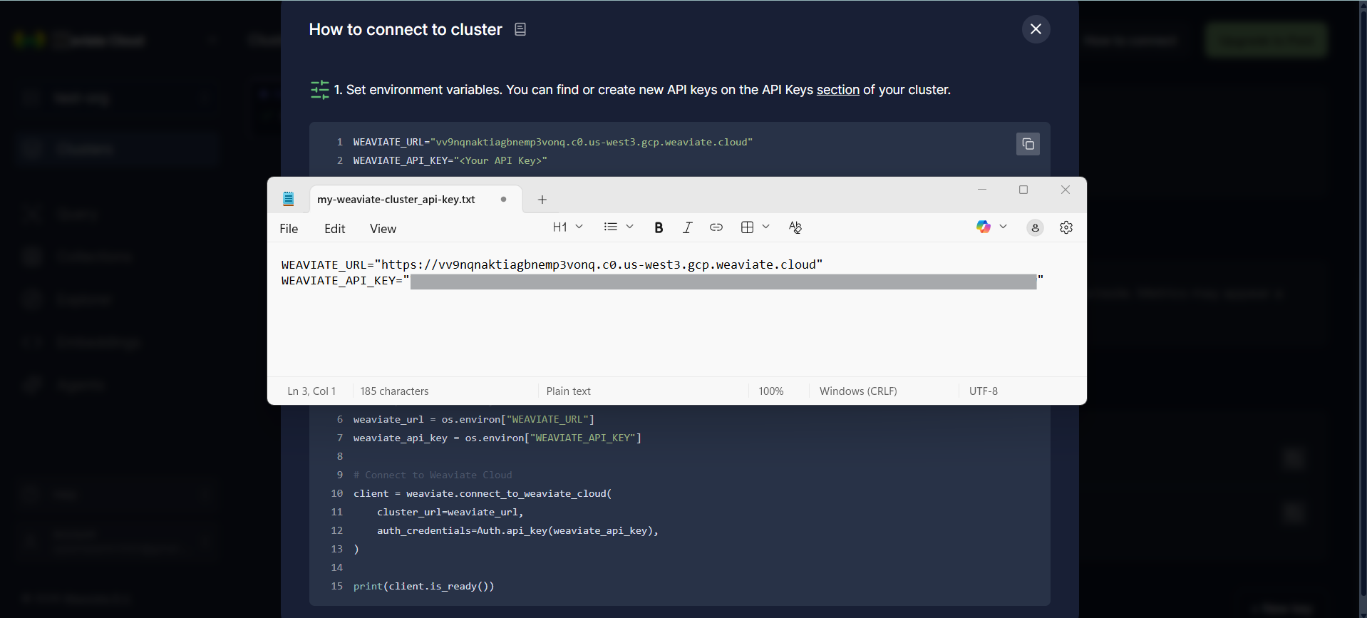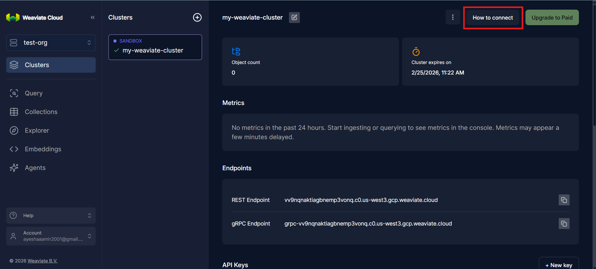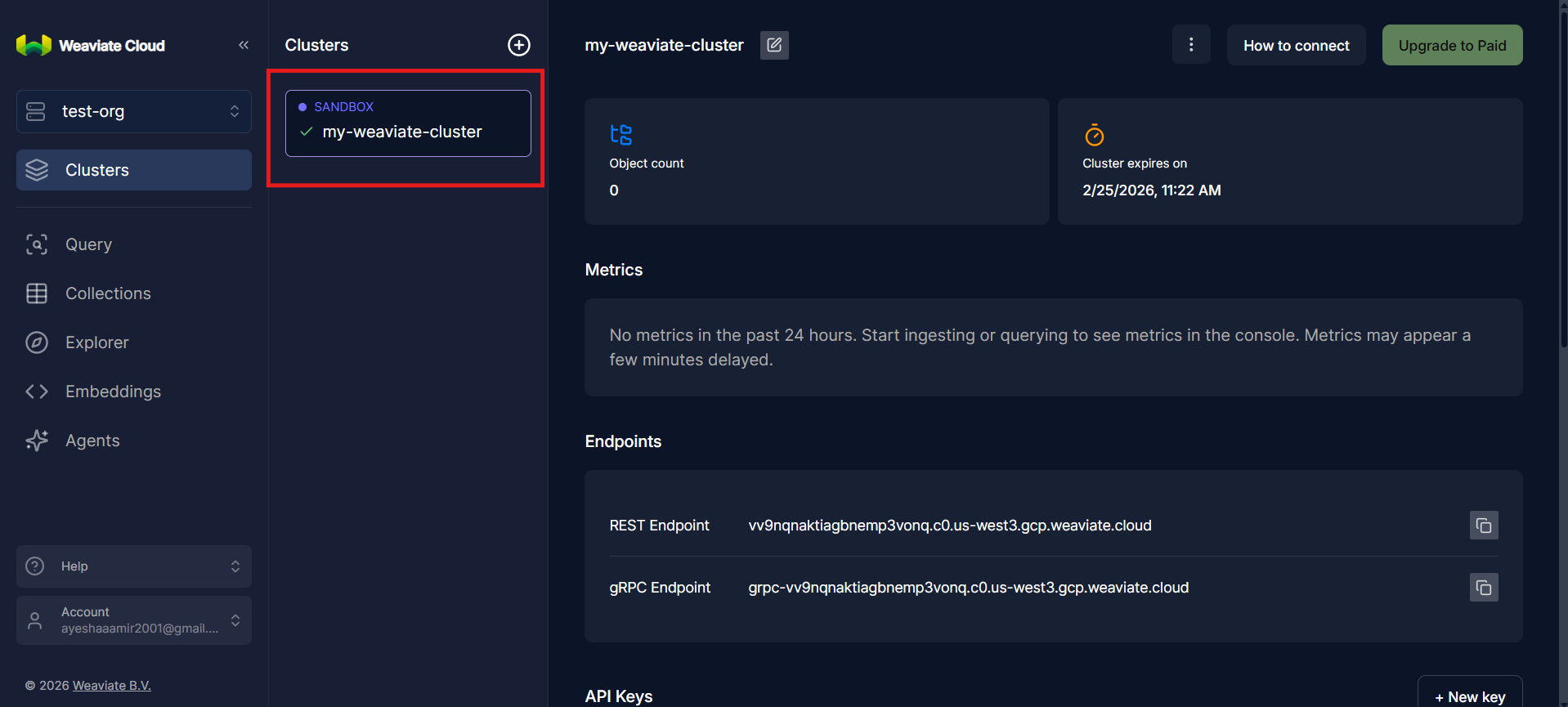 At this point, your Weaviate cluster is fully provisioned and accessible. You now have a running vector database, an authenticated API endpoint, and the necessary credentials ready to integrate directly into your application code.