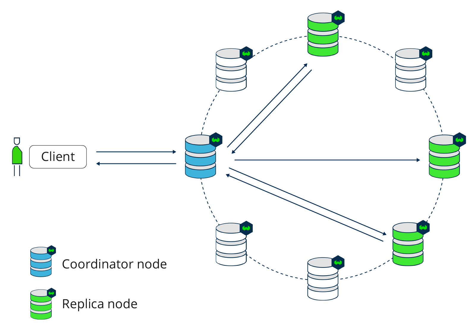 From an application’s perspective, a Weaviate cluster exposes a single endpoint that handles storing vector embeddings with metadata, indexing them for fast similarity search, and executing queries. A cluster may run as a single node in simple setups or multiple nodes for better scalability, reliability, and performance.