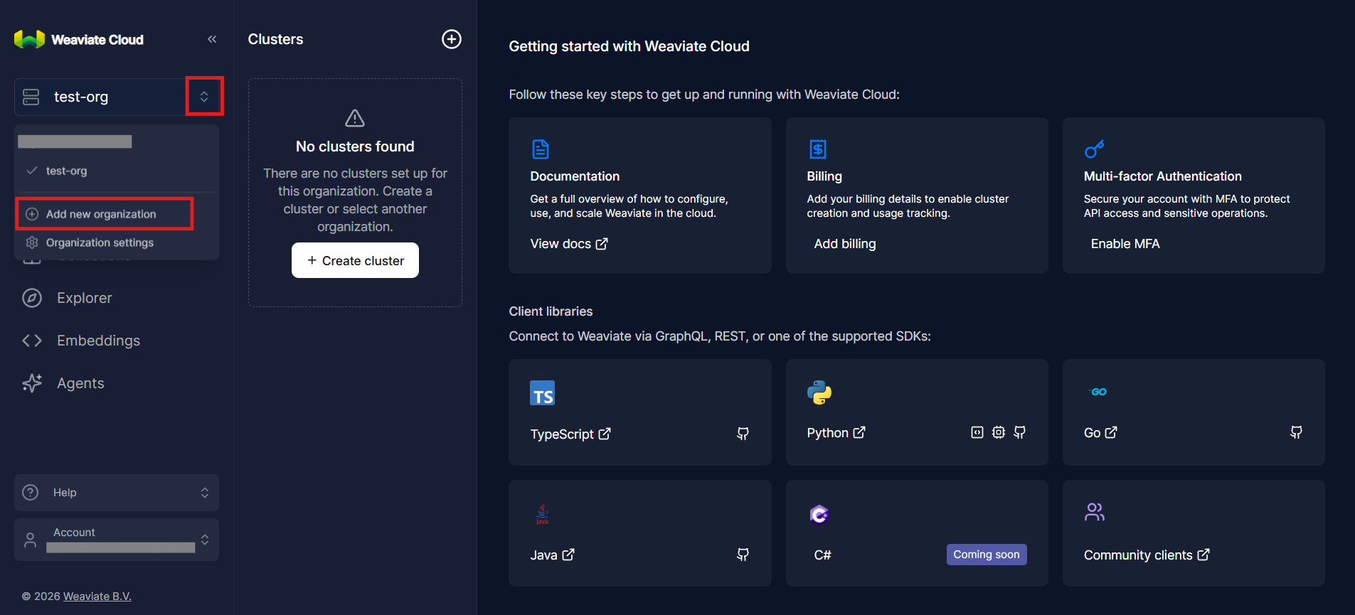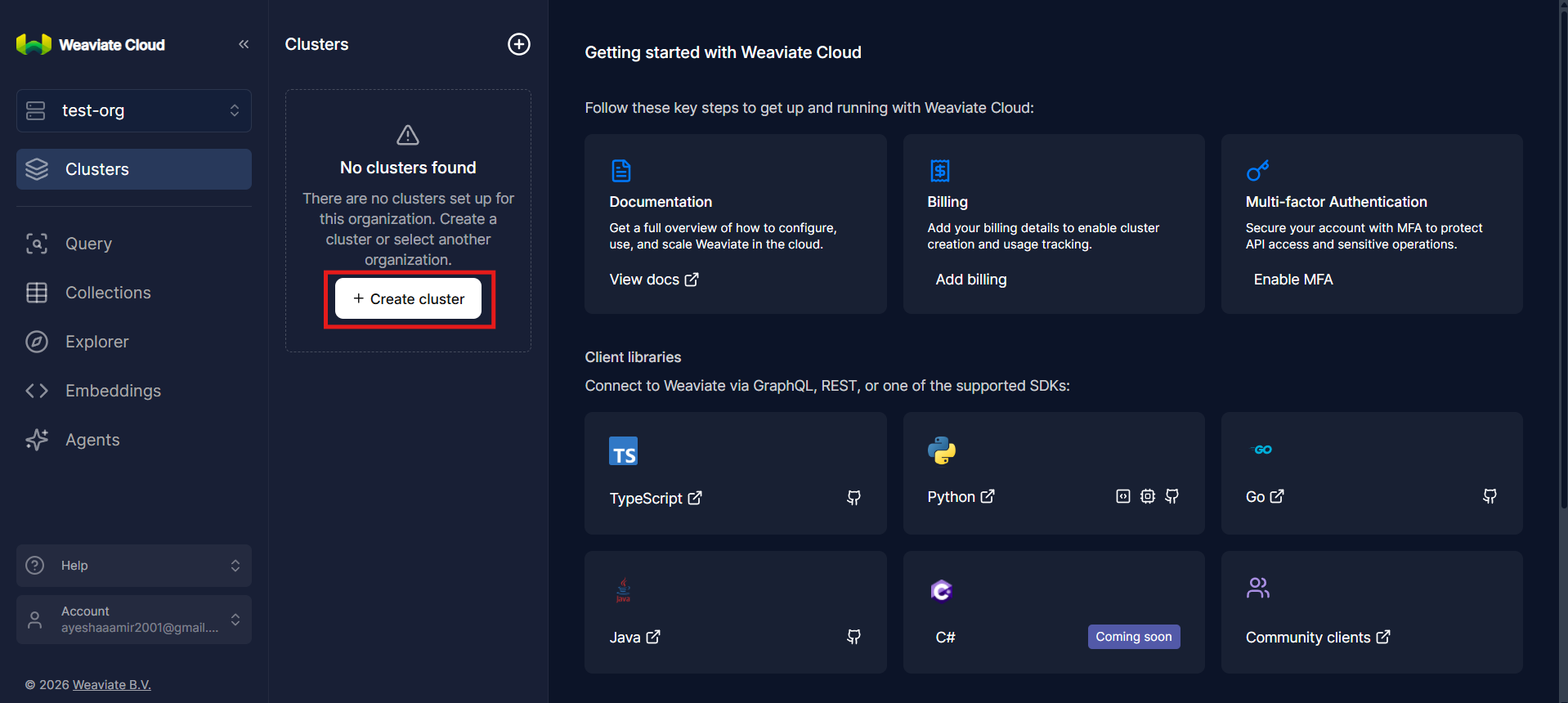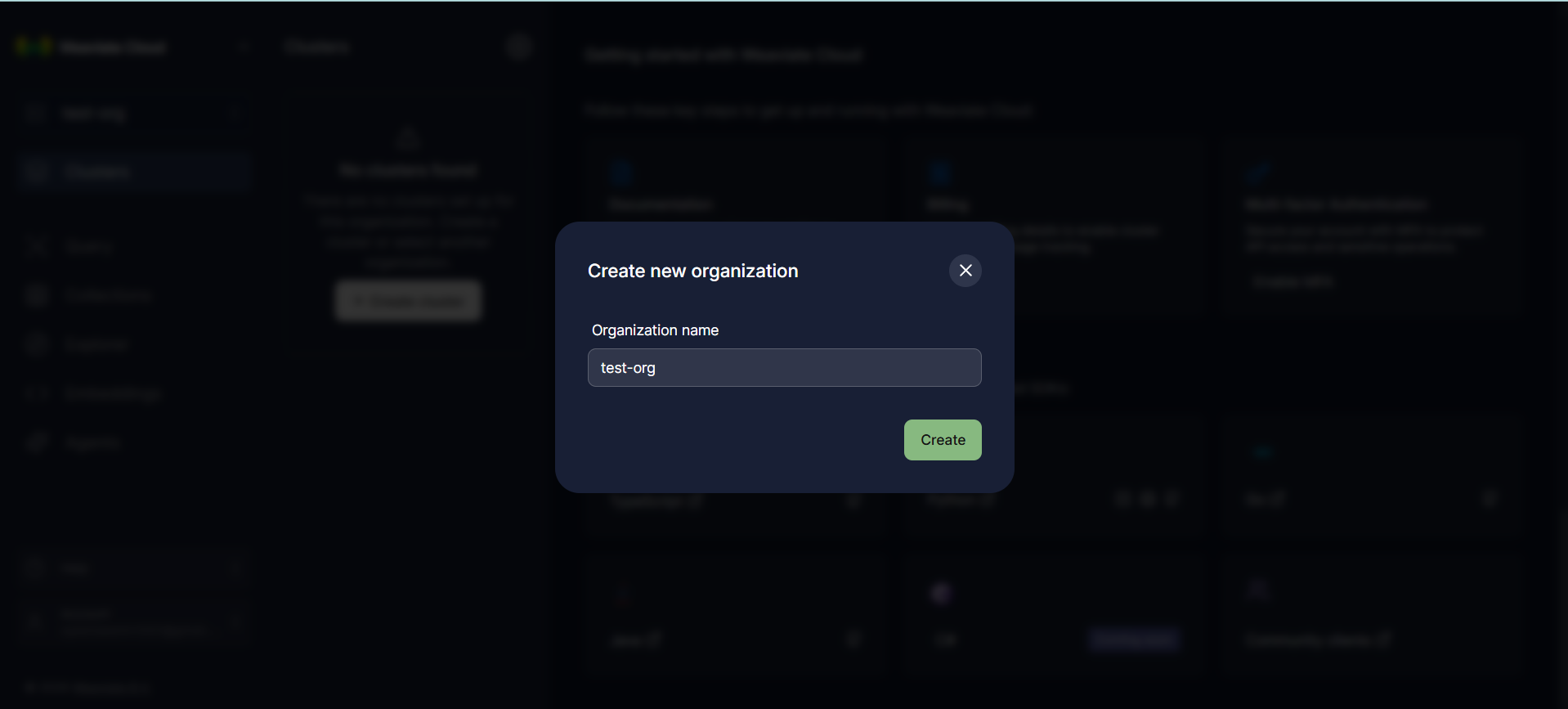 Creating an organization first is an important structural step. In Weaviate Cloud, an organization acts as a logical container for clusters, API keys, access control, and billing or usage boundaries. This mirrors how many cloud platforms separate resources by project or account. An organization allows you to group related weaviate clusters together and manage them consistently.