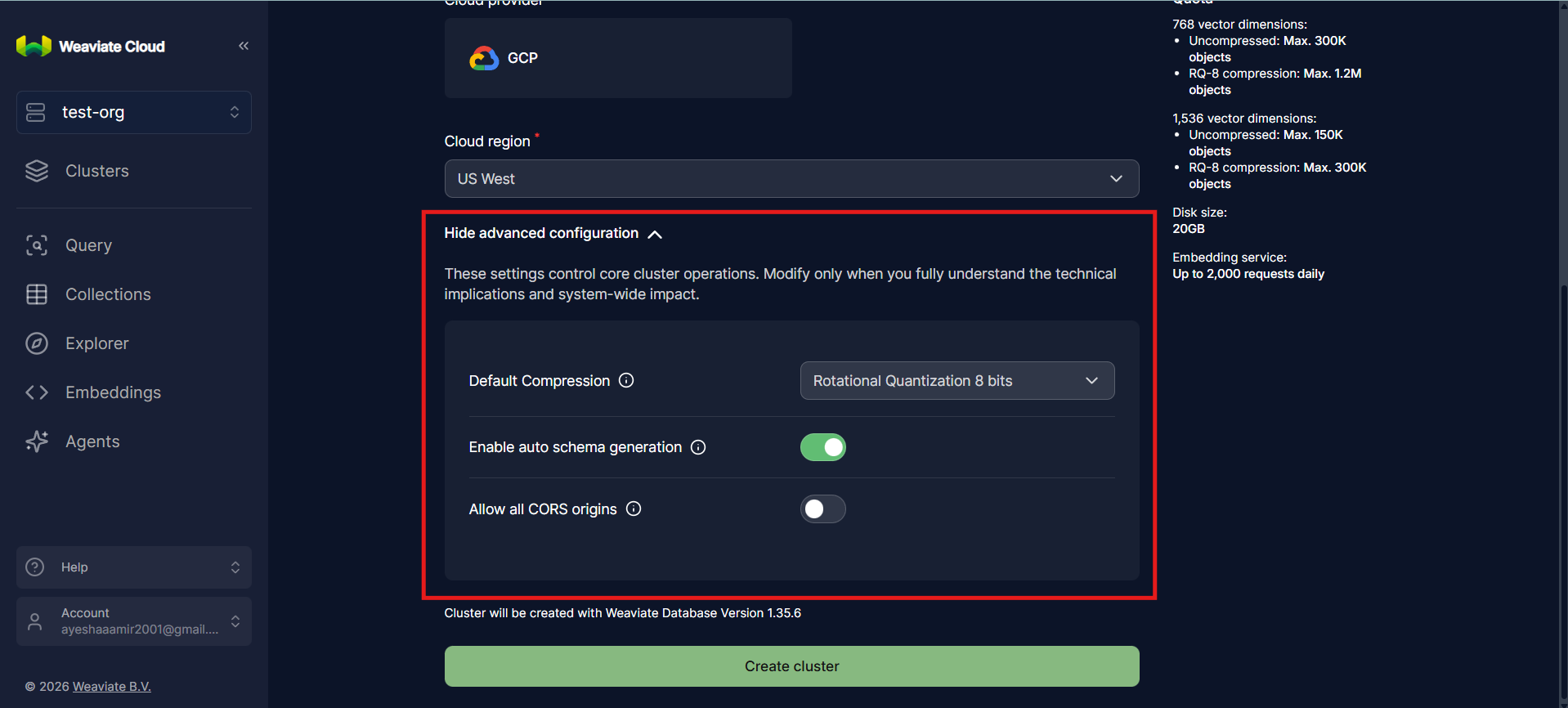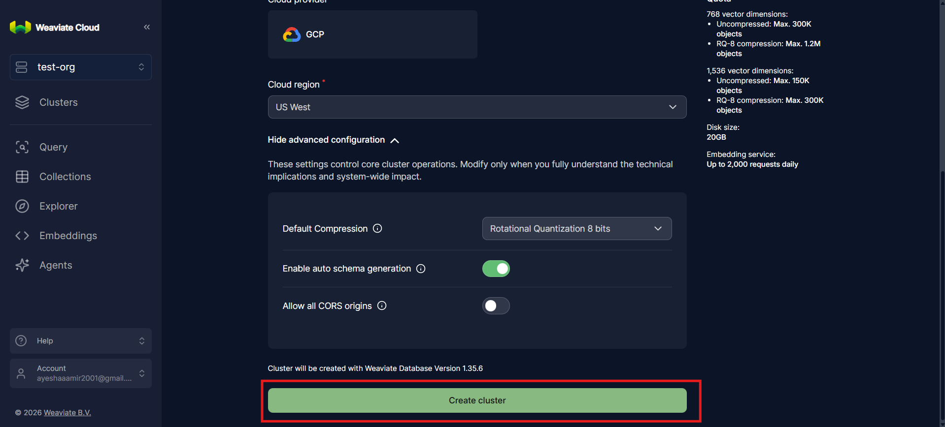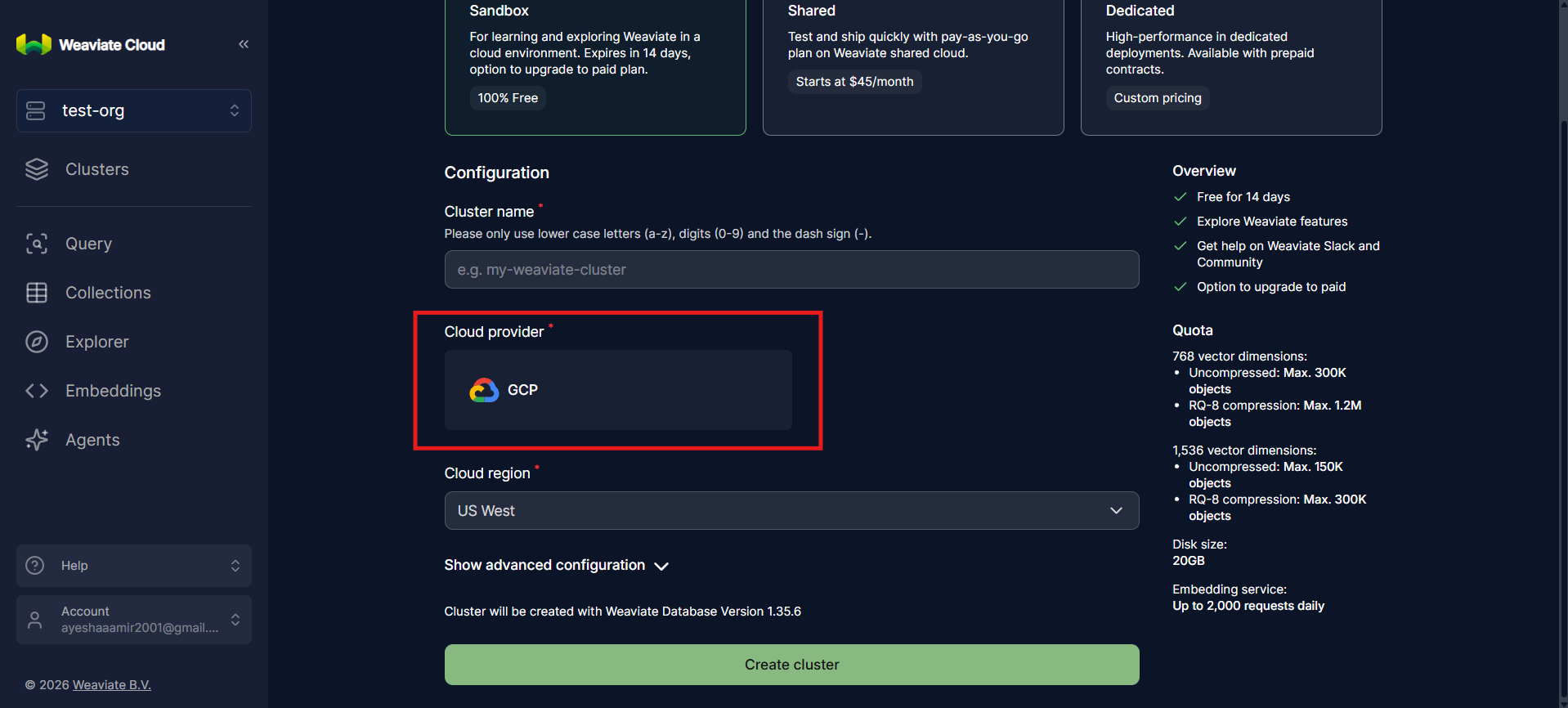 Under the newly created organization, click Create cluster. This initiates the workflow for provisioning a weaviate cluster. At this stage, you are defining the infrastructure that will store vectors, metadata, and indexes for semantic search.