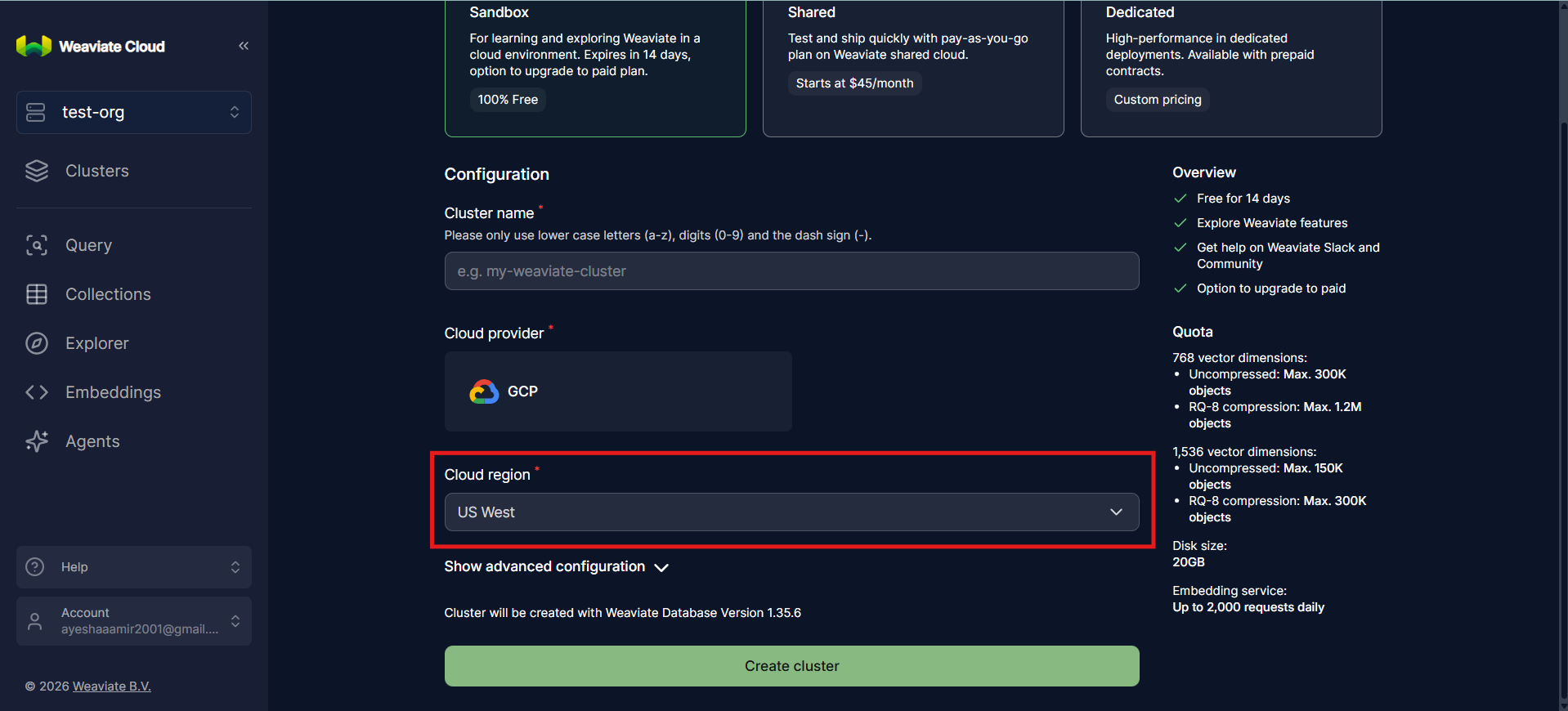 You will also choose a cloud provider (such as AWS, GCP, or Azure), which determines where your Weaviate cluster is physically hosted. This decision impacts latency between your application and the cluster, compliance and data residency requirements, and how easily the cluster integrates with other cloud services already in your infrastructure.