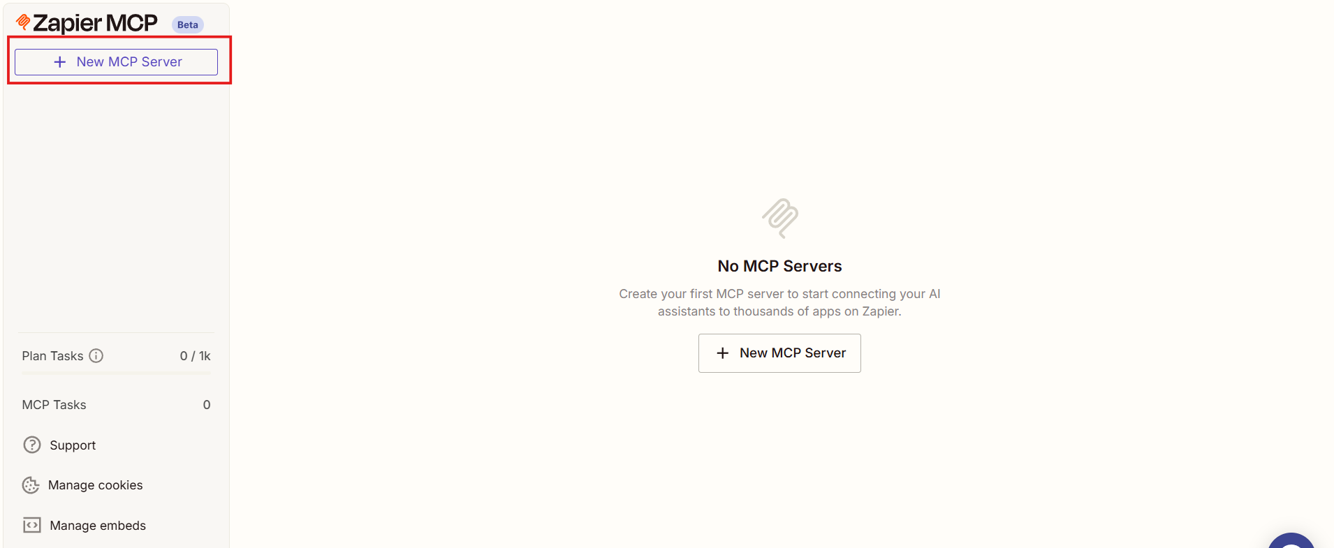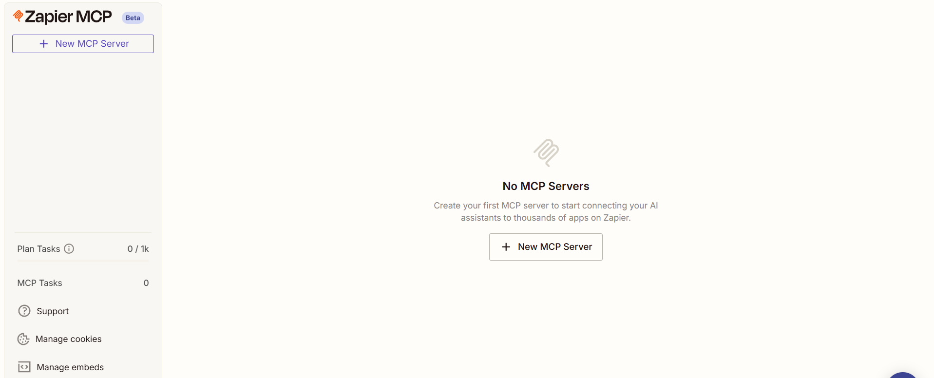 Click + New MCP Server to begin creating a new MCP server that will expose Zapier actions to external AI clients