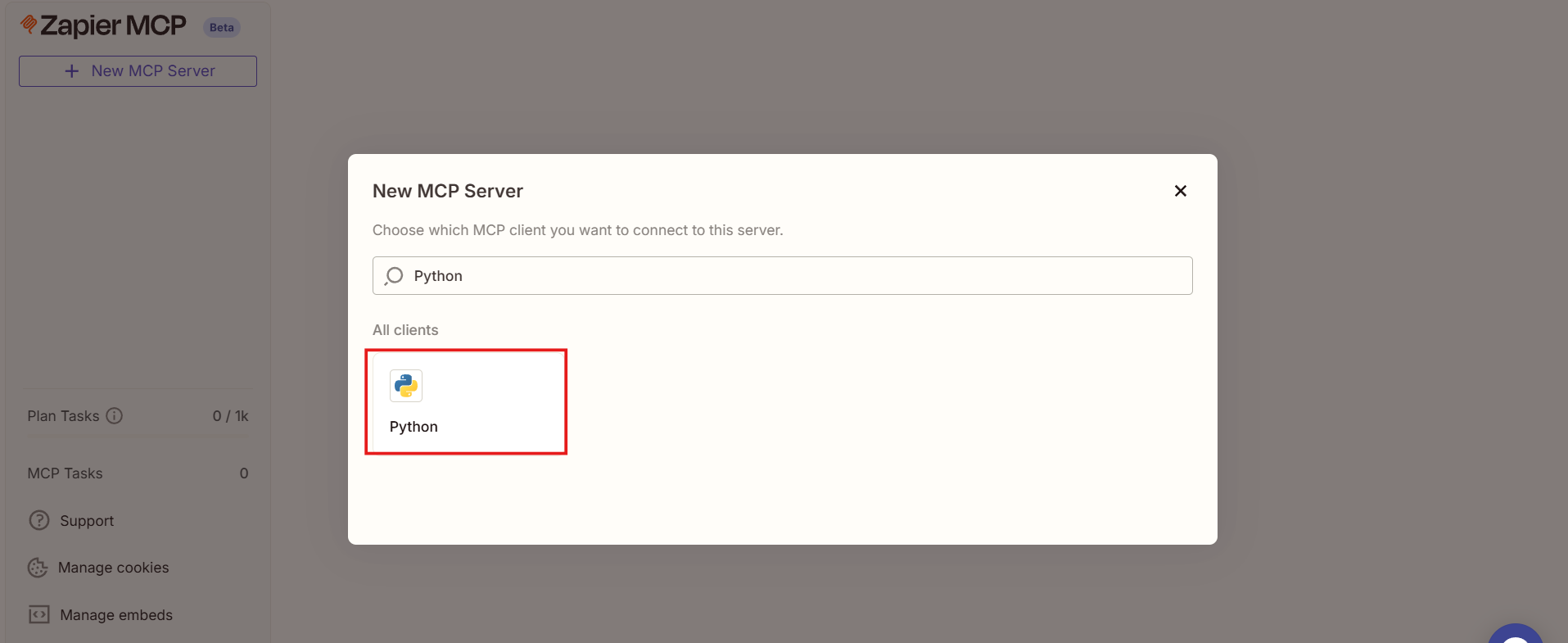 For MCP Client, select Python, which configures the server for Python-based agents and applications and determines the connection examples shown by Zapier