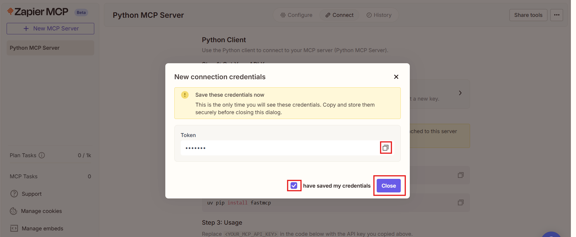 At this point, you should have the MCP server URL and the Zapier MCP API key. Treat these credentials like any other sensitive secret. Do not commit them to source control or expose them publicly.