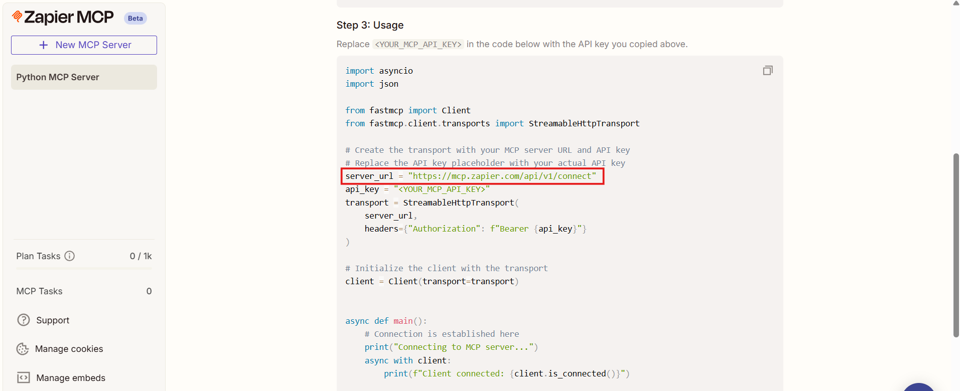 Scroll down and copy the server URL shown in the example code (This is important). Make sure you copy the server URL exactly as shown. This URL is what MCP clients will use to connect to Zapier.