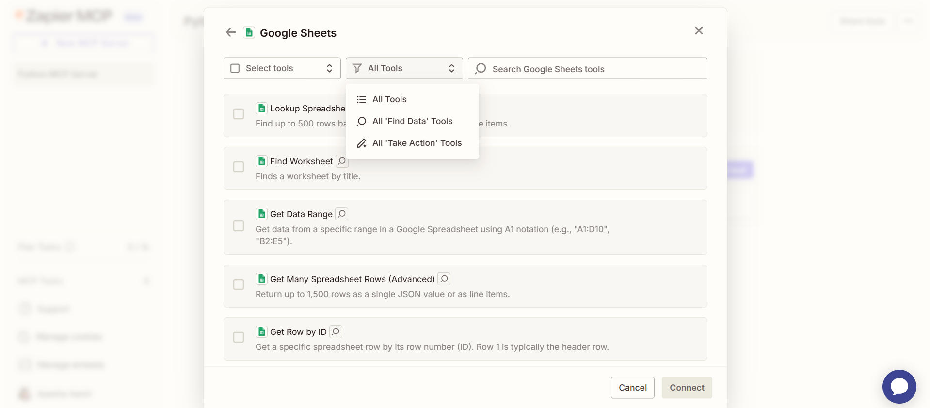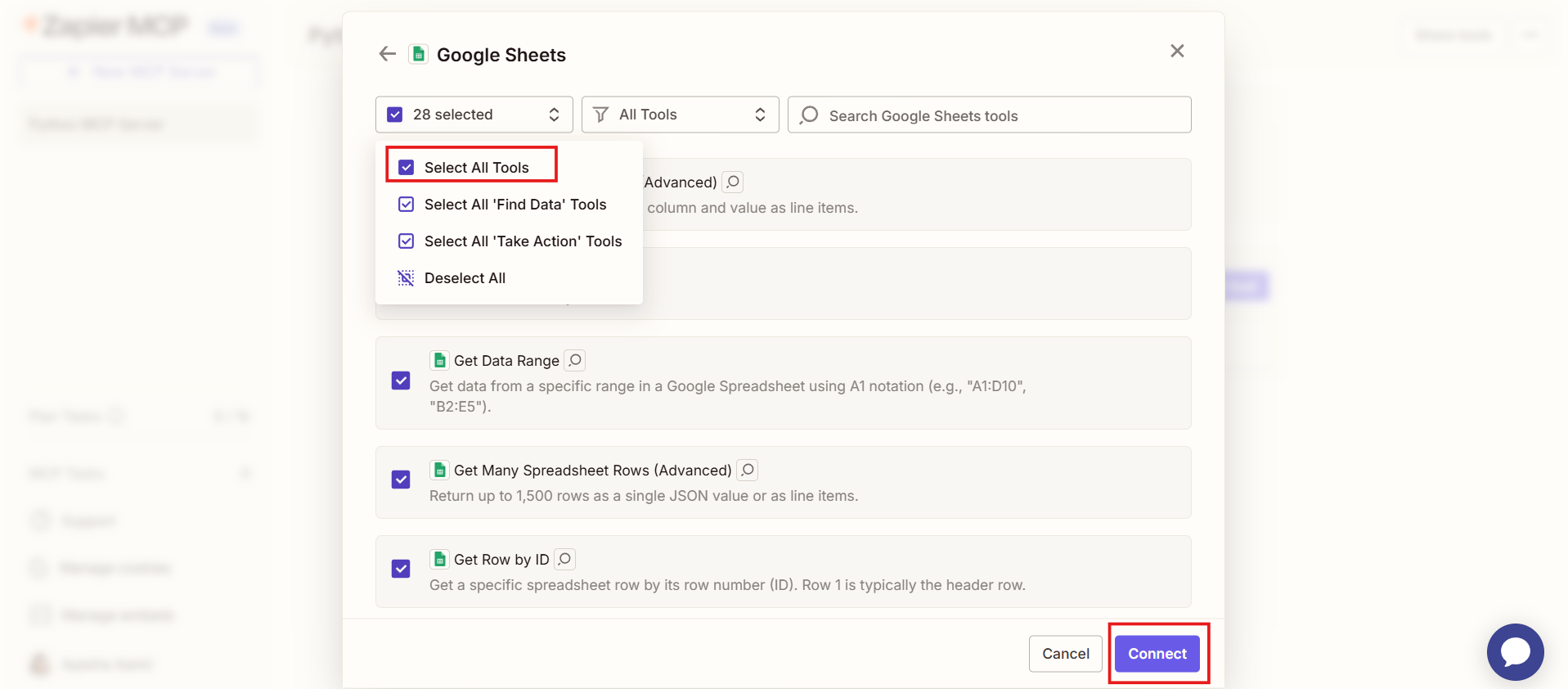 For quick setup, you can choose 'All', which exposes every supported action for that app. This is often the easiest option when experimenting or building general-purpose systems. Alternatively, you can select individual actions if you want tighter control. Once you have selected your required tools, you can click the 'Connect' button.
