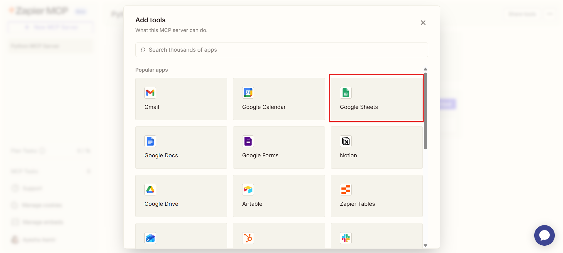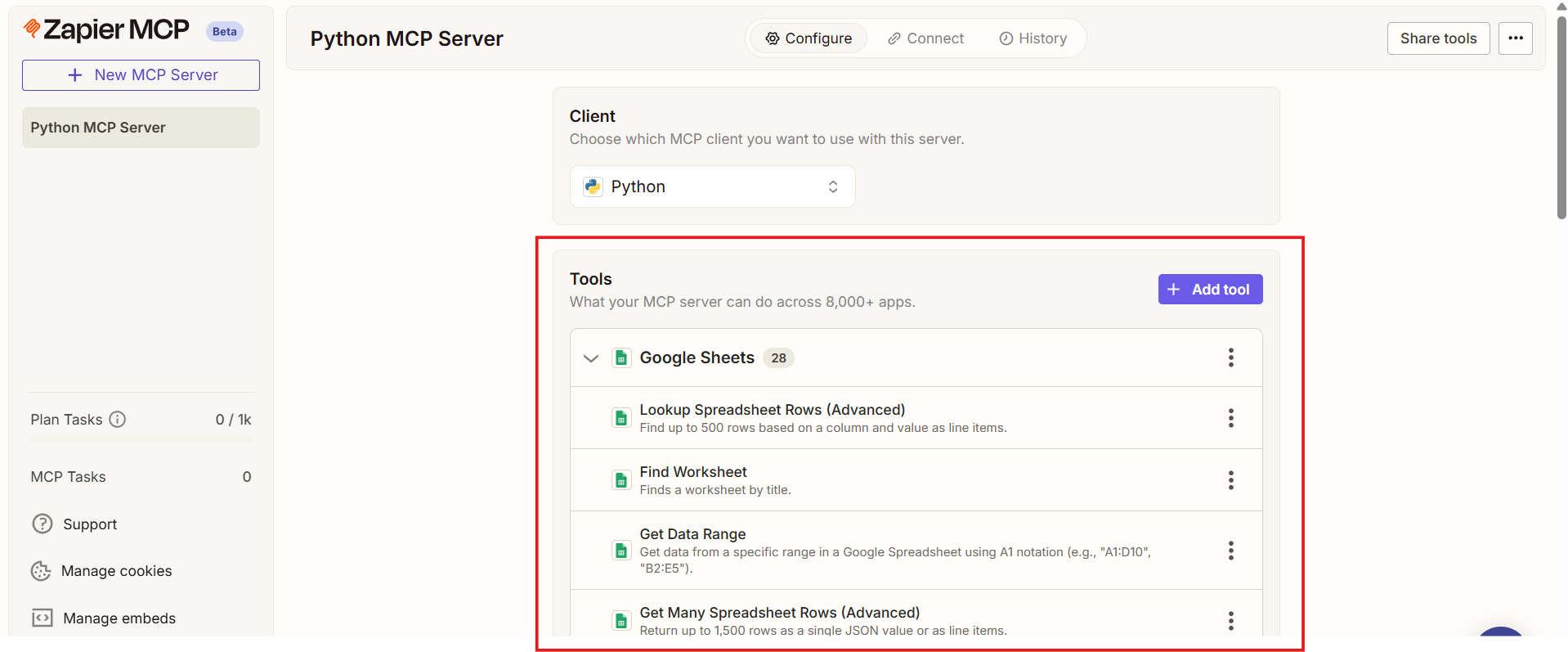 Zapier automatically adds the tools to your MCP server. These tools are now available to any MCP client that connects to the server.