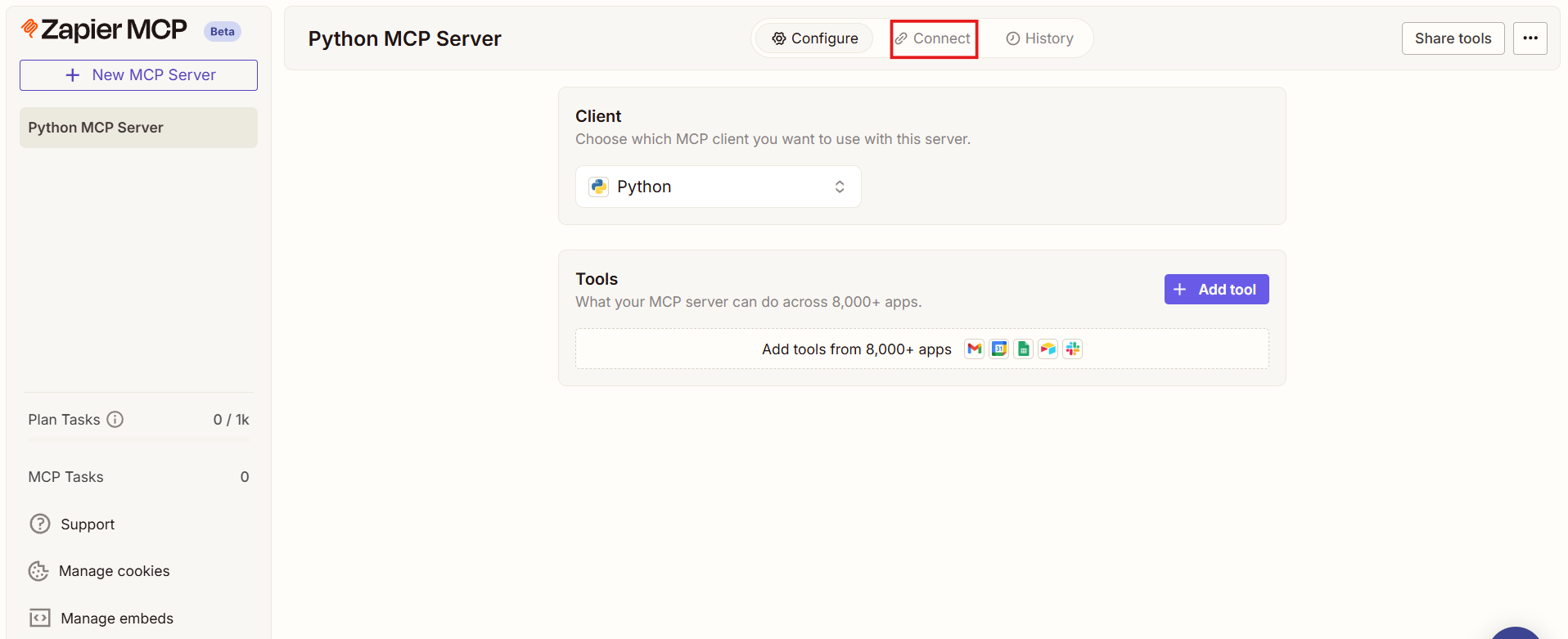 Once these options are selected, Zapier creates the MCP server and redirects you to its configuration page, where you can generate credentials, add tools, and manage how MCP clients connect and authenticate.