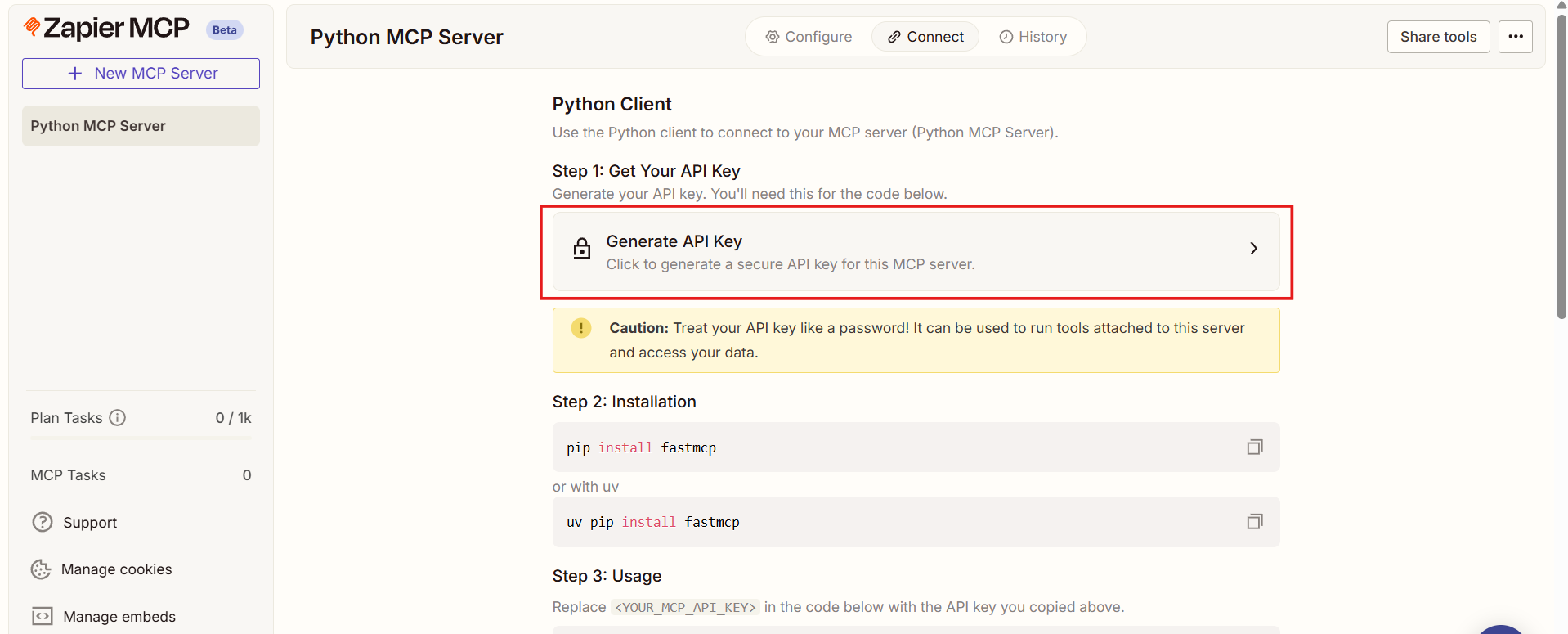 Click Generate an API key to create a credential that allows MCP clients to authenticate and make authorized requests to the server