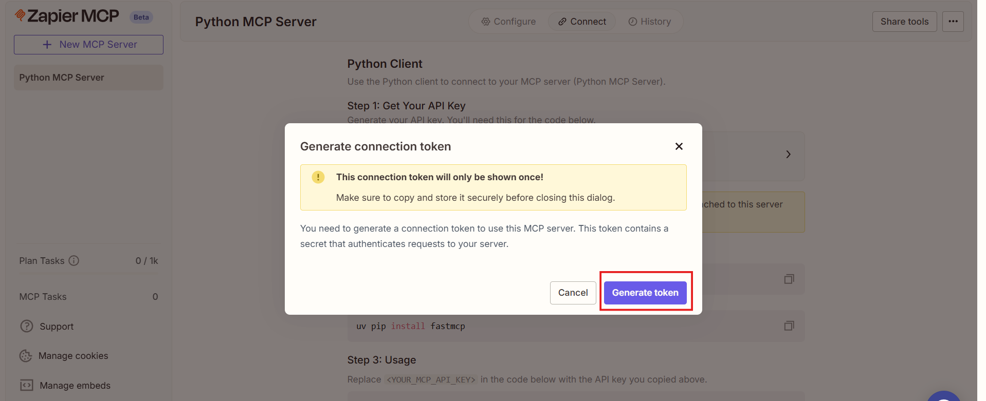 Once you do that, you will be prompted to Generate a connection token. This token contains the secret that will authenticate requests to your server.