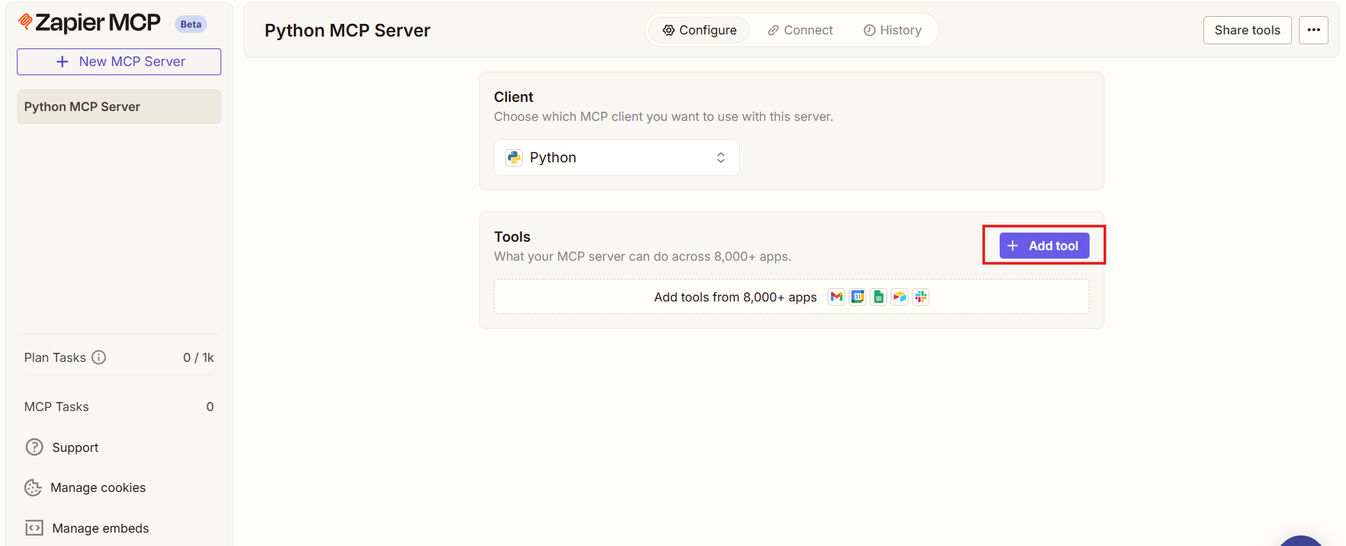 Click + Add tool to begin defining which actions and integrations this MCP server will expose to connected clients