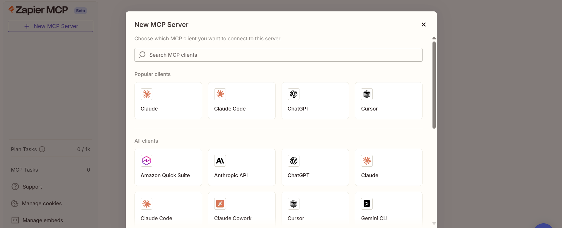 In this guide, we use a Python MCP client, but the Zapier-side setup is largely the same regardless of which client you use. The key idea is that the MCP server (Zapier) remains stable, while clients can change.