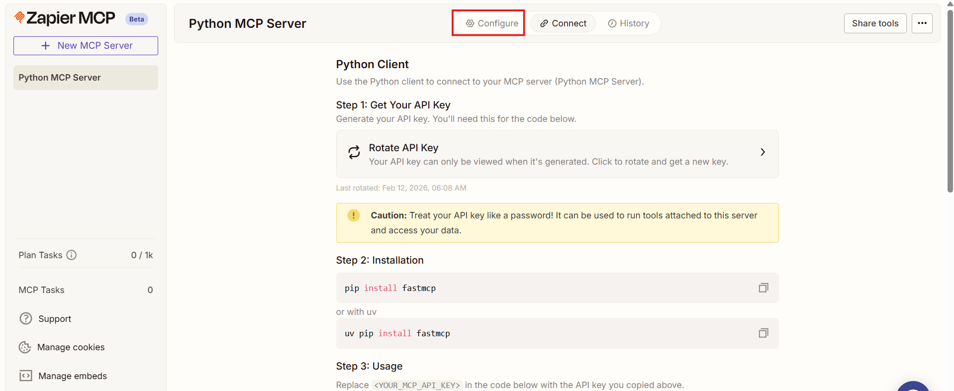 Go back to the Configure tab in your MCP server dashboard, where tools and server capabilities are managed